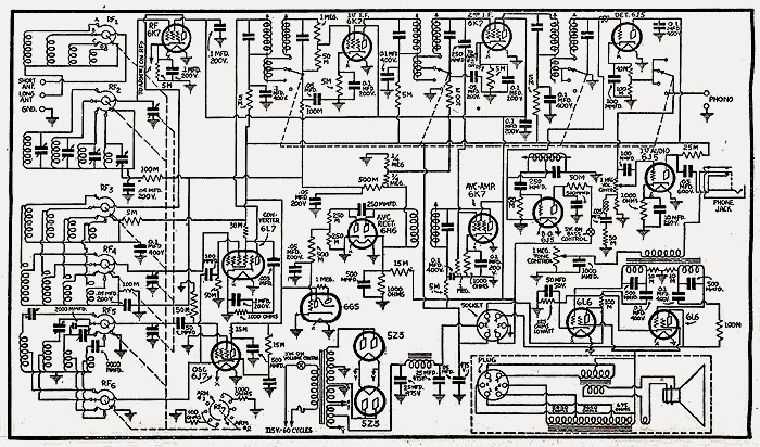 a.v.c. rectifier; 6J5 infinite impedance second detector; 6J5 audio-beat
