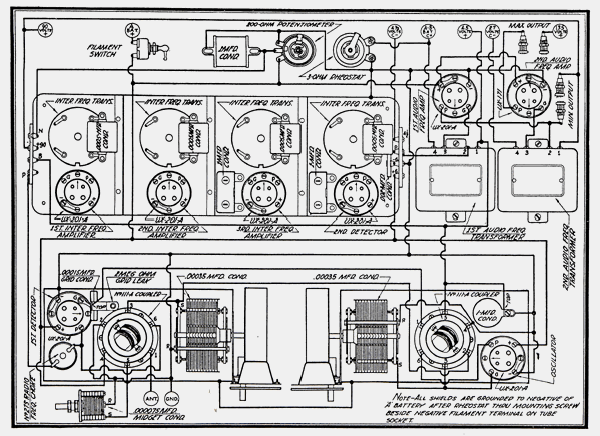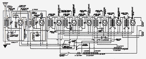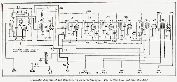 Schematic for the 1928 screen grid tube verson. Radio News, March
